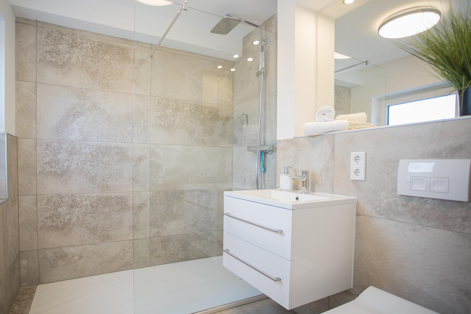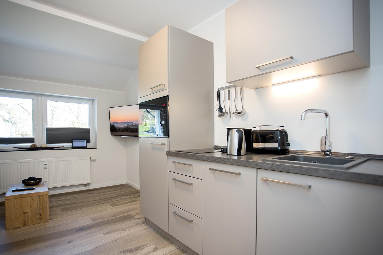 The bedroom with a double bed (2x 90x200cm) is next to the kitchen. The bedroom has a second TV so you can watch TV from the comfort of your bed. There are also 2 bedside tables, bedside lamps and a wardrobe. The sofa bed in the living room can accommodate 2 children. The bathroom has a walk-in/rain shower, toilet, washbasin and towel radiator. The accommodation overlooks the Sauerland mountains. You can enjoy a leisurely walk in the area with your dog, who can join you on holiday because this accommodation allows one pet. There is no washing machine in the accommodation, but you may use the one in the shared storage room for bikes and skis free of charge.