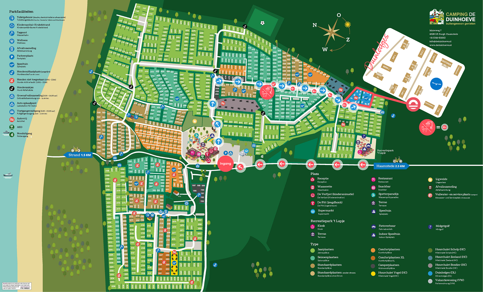 Camping Duinhoeve is more than just a comfortable stay; the park itself is a delightful destination for all ages. Start your day with fresh croissants from the Duinshop and explore the many facilities: a water playground, animation, a mini-cinema, and various indoor and outdoor play areas. Rent a bike and discover the surroundings via extensive walking and cycling routes. For extra convenience, there is a supermarket, restaurant, snackbar, laundrette, and souvenir shop. Modern amenities are also available: free WiFi and EcoTap charging stations for electric cars.