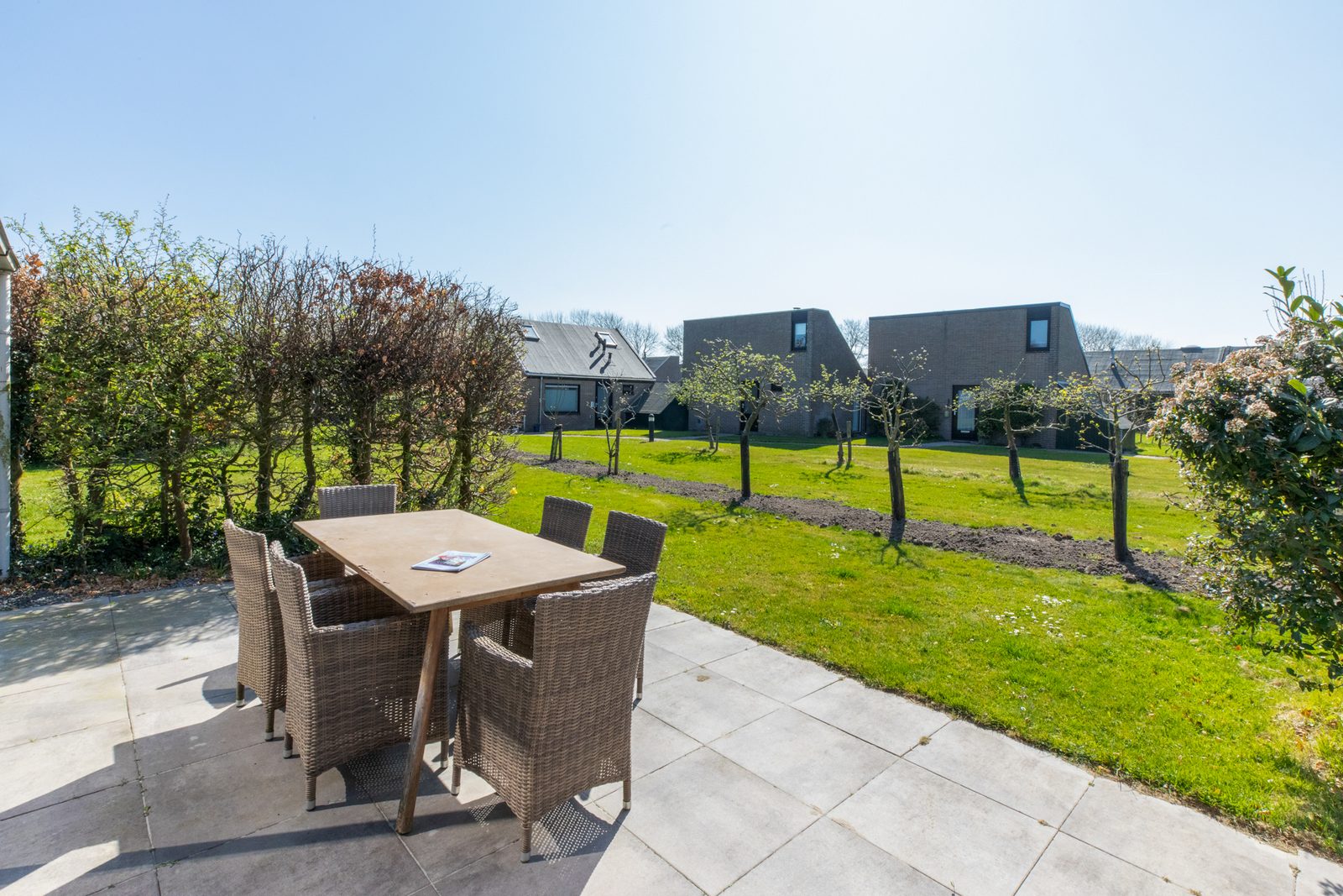 The house is located in a car-free zone on the property of Schouwen. A large lawn, a playground with equipment and a shared swimming pool (for a fee) are available.